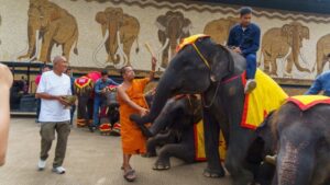 บรรยากาศเป็นไปอย่างคึกคักและน่าประทับใจ มีขบวนนางรำอันอ่อนช้อย และขบวนโขลงช้างกว่า 30 เชือก มาร่วมต้อนรับ พร้อมพวงมาลัยคล้องคอและสายสิญจน์สร้างความเป็นสิริมงคล นอกจากนี้ยังได้มีการเจิมหน้าผากแม่ช้างและลูกช้างตามความเชื่อโบราณเพื่อความร่มเย็นเป็นสุข