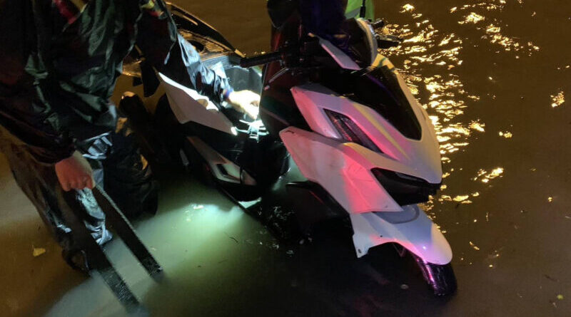 สลด!! หนุ่มเข็นมอไซค์ฝ่าน้ำท่วมถนน เจอคลื่นน้ำจากรถใหญ่ซัดจนล้มถูกไฟดูดเสียชีวิต