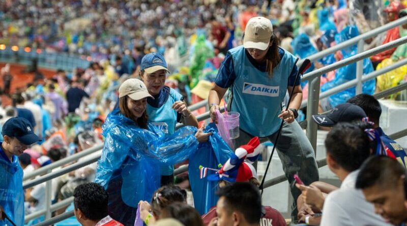 แฟนบอลไทยนับร้อยคนได้ลุกขึ้นมาร่วมเป็น “จิตอาสามือกาวทีมชาติ” ช่วยกันเก็บขยะพลาสติกทั่วสนามแข่งขัน ด้วยจิตอาสาและความภูมิใจที่ได้เป็นส่วนหนึ่งในการเชียร์บอลอย่างมีคุณภาพ ไม่เพียงแต่สร้างภาพลักษณ์ที่ดีให้กับฟุตบอลไทย แต่ยังปลูกฝังวัฒนธรรมการเชียร์ที่เต็มไปด้วยความรับผิดชอบต่อสังคม