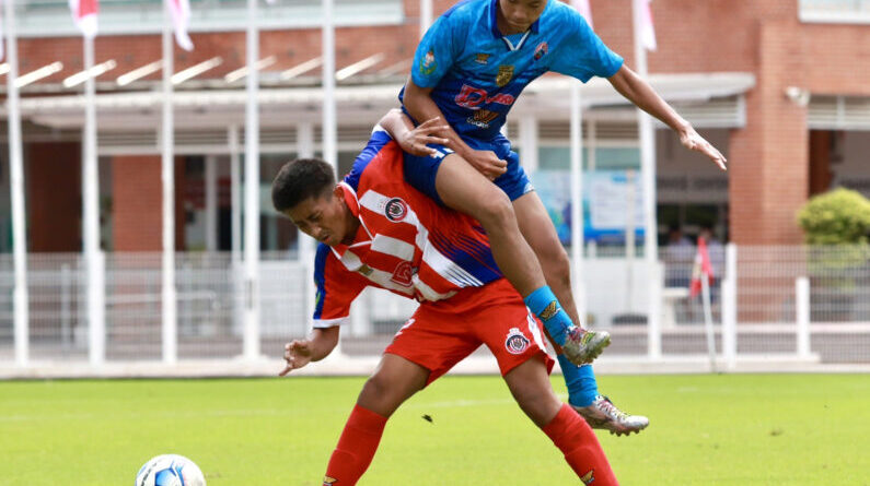 2…..แทนคุณ สุรัตตะเศรณี (เสื้อแดงขาว) นักเตะอัสสัมชัญธนบุรี ปะทะกับ นพภูชิสส์ หวนบุตตา ผู้เล่นทีมปทุมคงคา ในการแข่งขันฟุตบอลระหว่างโรงเรียน ประจำปี2568 รุ่นอายุ16ปี ก.”กรมพลศึกษา-เดลินิวส์คัพ2025” ที่สนามโรงเรียนอัสสัมชัญธนบุรี ผล อัสสัมชัญธนบุรี ชนะไป 3-2