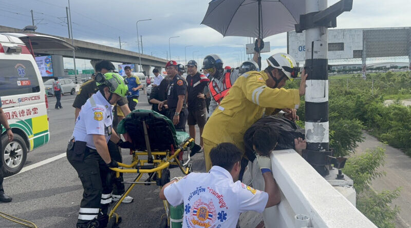 เมื่อเวลา 14.40 น. วันที่ 15 กันยายน 2568 ศูนย์สุวรรณภูมิ ได้รับแจ้งว่ามีเหตุรถชนขอบทางและเกิดเพลิงลุกไหม้ บนทางยกระดับสนามบินสุวรรณภูมิ สาย 1 มุ่งหน้าเข้าถนนมอเตอร์เวย์สาย 7 ในเขตของลาดกระบัง กรุงเทพมหานคร ซึ่งเป็นพื้นที่เขตติดต่อระหว่างสมุทรปราการ กับทางกรุงเทพมหานคร ศูนย์สุวรรณภูมิจึงประสาน สายตรวจจราจรที่อยู่ใกล้เคียงไปตรวจสอบที่เกิดเหตุ พอเจ้าหน้าที่เดินทางไปถึงพบว่าเริ่มมีแสงเพลิงและกลุ่มควันโพยพุ่งขึ้นที่หน้ารถ รปภ.จราจรจึงวิทยุขอสนับสนุนรถดับเพลิงและกู้ชีพกู้ภัย ก่อนจะรีบระดมถังดับเพลิงไปฉีดพยามดับไฟ แต่สุดท้ายไม่เป็นผล เปลวไฟเริ่มโหมลุกไหม้อย่างรุนแรง หลังจากนั้นไม่กี่นาทีต่อมาทีมดับเพลิงและกู้ภัยท่าอากาศยานสุวรรณภูมิ เดินทางมาถึงและเข้าระดมฉีดน้ำสกัดเพลิงใช้เวลาไม่นานเพลิงจึงสงบ และพอเจ้าหน้าที่ไปตรวจสอบที่หน้ารถนั่งส่วนบุคคลคันเกิดเหตุ ปรากฏว่าไปเจอรถจักรยานยนต์คันหนึ่งถูกชนติดมากับหน้ารถฝั่งซ้ายและเกิดเพลิงไหม้ทั้งคันจนเสียหาย แต่ไม่พบตัวคนขับรถจักรยานยนต์แต่อย่างใด เจ้าหน้าที่การท่าจึงกระจายกำลังเดินเท้าค้นหาจนไปเจอว่าตัวของผู้ขับขี่รถจักรยานยนต์นั้น ถูกชนจนร่างกระเด็นขึ้นไปติดค้างอยู่บนขอบราวสะพานยกระดับและอัดติดคาอยู่ที่ซอกสาไฟฟ้าส่องสว่าง โดยพบว่าอาการสาหัสและมีเหล็กปักธงที่อยู่โคนเสาไฟเสียบคาขาของคนขับรถจักรยานยนต์คันเกิดเหตุ จึงประสานร้องขอรถพยาบาลจากโรงพยาบาลจุฬารัตน์ 9 และทีมกู้ภัยที่สูงพร้อมเครื่องตัดถ่างจากมูลนิธิร่วมกตัญญูมาช่วยเหลือที่เกิดเหตุ เนื่องจากต้องใช้เครื่องตัดถ่างงัดโคนเสาและตัดเหล็กที่เสียบคาขาของผู้บาดเจ็บออก โดยการช่วยเหลือในครั้งนี้ค่อนข้างยากลำบากสำหรับเจ้าหน้าที่ เนื่องจากเป็นช่องแคบและตัวผู้บาดเจ็บเองนอนคว่ำหน้าอยู่บนขอบราวสะพาน ซึ่งมีความเสี่ยงที่อาจจะพลิกตกลงไปด้านล้างของพื้นราบได้ หลังจากที่ทีมกู้ภัยได้ประเมินสถานการณ์และวางแผนในการช่วยเหลือในการเซฟตี้ตัวผู้บาดเจ็บแล้วจึงปฏิบัติการช่วยเหลือนำขาออกมาจากซอกเสาได้สำเร็จ ใช้เวลาพอสมควรกว่าจะช่วยออกมาได้ ซึ่งพบว่าผู้บาดเจ็บอาการสาหัส