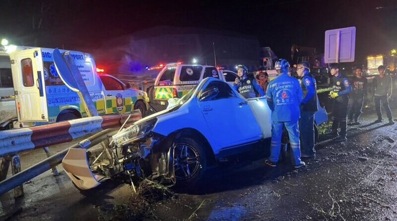 ชุมพร – กระบะบรรทุกรั้วหลับในชนเสาไฟฟ้าติดภายในตัวรถ ดับ 1 ราย