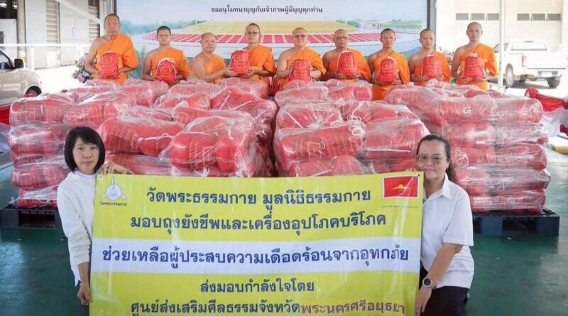 วันที่ 19 กันยายน 2568 พระมหานพพร ปุญฺญชโย ป.ธ.9 ผู้ช่วยเจ้าอาวาสวัดพระธรรมกาย จังหวัดปทุมธานี กล่าวว่า เพื่อบรรเทาความเดือดร้อนของประชาชนที่ได้รับผลกระทบจากสถานการณ์น้ำท่วมในจังหวัดพระนครศรีอยุธยา วัดพระธรรมกาย และมูลนิธิธรรมกาย พร้อมด้วยคณะศิษยานุศิษย์ ได้ร่วมกันจัดโครงการสาธารณสงเคราะห์มอบถุงยังชีพแก่ผู้ประสบภัยน้ำท่วมอย่างเร่งด่วน