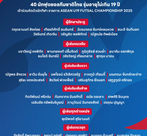 ​สมาคมกีฬาฟุตบอลแห่งประเทศไทย ในพระบรมราชูปถัมภ์ ประกาศรายชื่อ 40 นักฟุตซอลชายทีมชาติไทย รุ่นอายุไม่เกิน 19 ปี เข้าร่วมคัดตัวนักกีฬา รายการ ASEAN U19 FUTSAL CHAMPIONSHIP 2025 ระหว่างวันที่ 22-28 ธันวาคม 2568 ที่อาคารโรงยิมเนเซียม อบจ.นนทบุรี