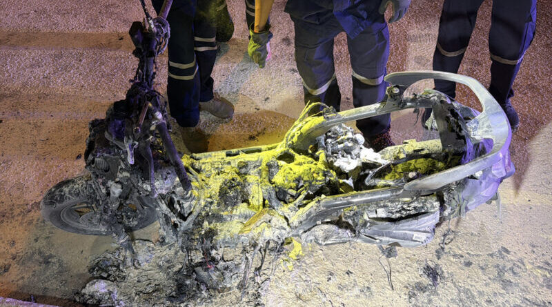 ที่เกิดเหตุพบรถจักรยานยนต์ ยี่ห้อ ฮอนด้า จีออโน่ หมายเลขทะเบียน 8 ขก 7641 กรุงเทพมหานคร ถูกเพลิงลุกไหม้เสียหายทั้งคัน เหลือเพียงโครงเหล็กและเครื่องยนต์ที่ไหม้เกรียม เจ้าหน้าที่ใช้น้ำยาดับเพลิงควบคุมไฟจนสงบ โชคดีไม่มีใครได้รับอันตราย