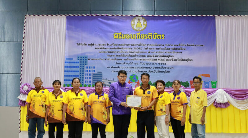 วันที่ 25 กันยายน 2568 นายมนต์ชัย วิวัฒน์ธนาฒย์ นายกองค์การบริหารส่วนจังหวัดพิษณุโลก มอบหมายให้ นายเอกพงษ์ กุลเจริญ รองนายกองค์การบริหารส่วนจังหวัดพิษณุโลก ร่วมเป็นเกียรติในพิธีมอบเกียรติบัตรให้กับวัด หมู่บ้าน/ชุมชน โรงเรียน และส่วนราชการที่จัดการขยะต้นทาง สะอาด และใช้ประโยชน์จากขยะ และพิธีลงนามบันทึกข้อตกลง (MOU) ว่าด้วยความร่วมมือการขับเคลื่อนและขยายผลการเป็นหน่วยงานต้นแบบ ด้านการจัดการขยะต้นทาง สะอาด และใช้ประโยชน์จากขยะ ของจังหวัดพิษณุโลก ตามแผนในการขับเคลื่อนการบริหารจัดการขยะ (Road Map) ของจังหวัดพิษณุโลก ประจำปีงบประมาณ พ.ศ.2568 โดยมี นายทวี เสริมภักดีกุล ผู้ว่าราชการจังหวัดพิษณุโลก เป็นประธานในพิธี พร้อมด้วย นายปรีชา แดงแสงทอง ท้องถิ่นจังหวัดพิษณุโลก และหัวหน้าส่วนราชการที่เกี่ยวข้องร่วมพิธี ณ ห้องประชุมนครสรลวงสองแฅว อาคารบึงราชนก อำเภอวังทอง จังหวัดพิษณุโลก