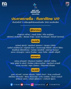 สมาคมกีฬาฟุตบอลแห่งประเทศไทย ในพระบรมราชูปถัมภ์ ประกาศรายชื่อ 41 นักฟุตบอลชายทีมชาติไทย รุ่นอายุไม่เกิน 17 ปี เก็บตัวฝึกซ้อม เพื่อเตรียมความพร้อมก่อนทำการแข่งขันฟุตบอลชายชิงแชมป์เอเชียรุ่นอายุไม่เกิน 17 ปี รอบคัดเลือก (AFC U17 Asian Cup Saudi Arabia 2026 Qualifiers) ระหว่างวันที่ 22-30 พฤศจิกายน 2568