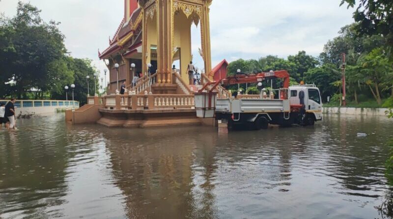 ปทุมธานี – น้ำล้นตลิ่งเข้าท่วมลานวัดริมแม่น้ำเจ้าพระยาปชช.ต้องแบกโลงศพใส่รถไปเผาที่เมรุ