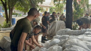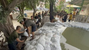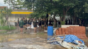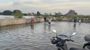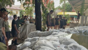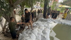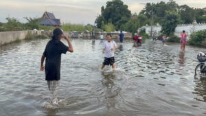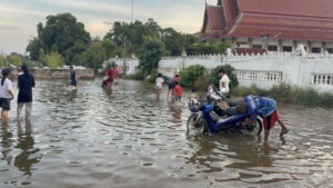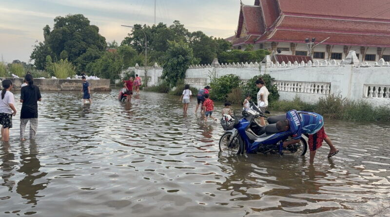 อ่างทอง ระทึกช่วงเย็นน้ำเจ้าพระยาลอดเขื่อนผุดขึ้นข้างกำแพงวัดต้นสนขยายวงกว้าง เจ้าหน้าที่ทหารเร่งวางกระสอบปิดล้อม ส่วนเด็ก ๆ ต่างวิ่งเล่นน้ำบริเวณที่น้ำผุดเอ่อไหลเข้ามาบริเวณริมเขื่อนกันอย่างสนุกสนาน