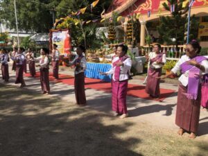 ประธานในพิธีและคณะได้โปรยข้าวตอกดอกไม้ รำสมโภชเบิกฤกษ์ ก่อนเข้าสู่พิธีเจริญพระพุทธมนต์