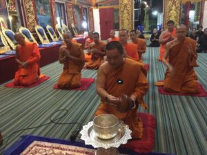 จากนั้นพระอธิการ ชาญชัย กตฺวีโร เจ้าอาวาสวัดร้องอ้อ จุดเทียนถวายพระพุทธ หน้าองค์พระประธานในพระวิหาร จากนั้นนำพระภิกษุสามเณร และชาวบ้าน ร่วมสวดเจริญพุทธมนต์ทำวัตร หน้าพระฉายาลักษณ์ สมเด็จพระนางเจ้าสิริกิติ์ พระบรมราชินีนาถ พระบรมราชชนนีพันปีหลวง และกรวดน้ำอุทิศถวาย เป็นพระราชกุศล