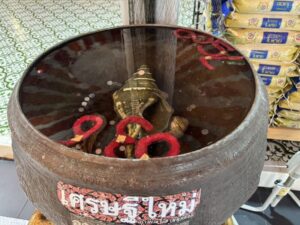 โดยสิ่งของต่างๆที่มาแก้บนทั้งหมดทางอาศรมจะนำไนปบริจาคให้ทางโรงเรียน วัด โรงพยาบาล มูลนิธิต่างๆเพื่อนำไปใช้ประโยชน์ต่อไป ก่อนกลับหลายคนยังได้ไปส่องเลขอ่างน้ำมนต์หน้าองค์ปู่ฤาษีพรหมเมศเพื่อนำไปเสี่งโชคโดยเลขอ่างน้ำมนได้แก่ 0 1 3 5 8 9 ที่ลอยวนจับคู่กันเรียกว่าเทวะบันดาล