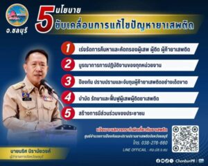 นายนริศ นิรามัยวงศ์ผู้ว่าราชการจังหวัดชลบุรีมอบนโยบายการขับเคลื่อนการแก้ไขปัญหายาเสพติดในพื้นที่จังหวัดชลบุรีให้กับภาคส่วนที่เกี่ยวข้อง สอดคล้องกับนโยบายรัฐบาลตามแนวทาง “Quick Big Win : ขับเคลื่อนอย่างรวดเร็วสู่ชัยชนะที่ยิ่งใหญ่”แนวนโยบายสำคัญ 5 ด้าน