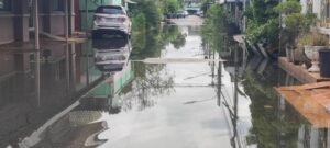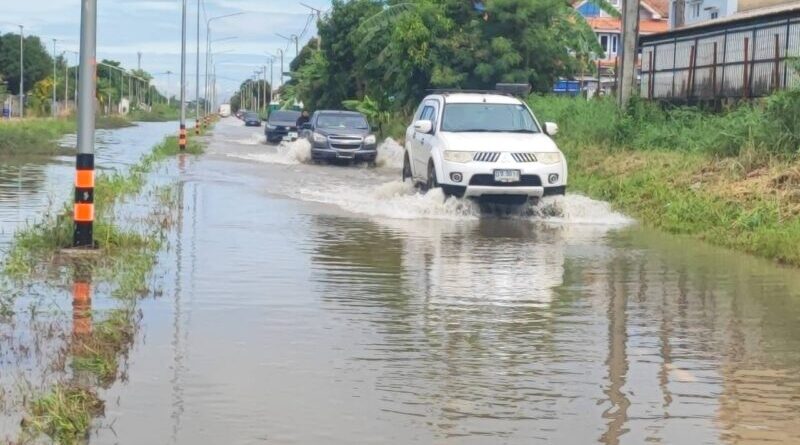 ปทุมธานีจนท.เร่งสูบน้ำออกจากถนนหลังฝนตกลงมาหลายวันทำน้ำท่วม