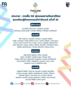 ประกาศ : รายชื่อ 50 นักฟุตบอลชายทีมชาติไทย ชุดเตรียมสู้ศึกมหกรรมซีเกมส์ ครั้งที่ 33