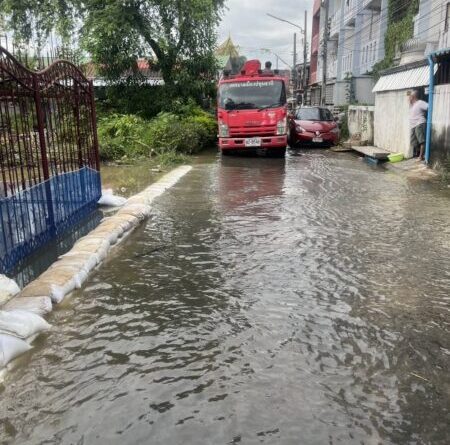วันที่ 6 พ.ย. 2568 ที่หน้าตลาดสดเทศบาลเมืองปทุมธานี ต.บางปรอก อ.เมือง จ.ปทุมธานี ได้เกิดภาวะน้ำในแม่น้ำเจ้าพระยาได้เอ่อล้นสูงขึ้นเข้าท่วมตลาดสด ตลาดศิริวัฒนา ด้านรอยต่อวัดหงษ์ไปถึงสะพานปทุมธานี1น้ำได้เอ่อล้นข้ามถนนเข้ามาชั้นใน และมีน้ำผุดขึ้นจากท่อระบายน้ำและช่องถนนที่แตกออก นายกเทศมนตรีเทศบาลเมืองปทุมธานีได้นำกำลังเจ้าหน้าที่ป้องกันบรรเทาภัยออกนำกระสอบทรายเสริมแนวคันกั้นน้ำเพื่อไม่ให้น้ำเข้าทะลักท่วมชั้นในได้ ซึ่งใช้กระสอบทรายจำนวนมากตั้งแนวกั้น จนสามารถกั้นน้ำได้และได้เร่งเครื่องสูบน้ำระบายออกสู่แม่น้ำเจ้าพระยาทันที
