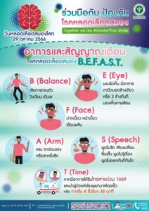 ปัจจัยเสี่ยงของโรคหลอดเลือดสมอง ได้แก่ ผู้ที่มีโรคประจำตัวได้แก่ โรคหัวใจ เบาหวาน ความดันโลหิตสูง ไขมันในเลือดสูง การสูบบุหรี่และบุหรี่ไฟฟ้า ขาดการออกกำลังกาย ภาวะเครียด โรคอ้วน มีไขมันในเลือดสูง ซึ่งสัญญาณเตือนของโรคหลอดเลือดสมอง คือ B.E.F.A.S.T มีดังนี้