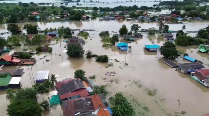 วันที่ 6 พ.ย. 68 ภาพมุมสูงสถานการณ์น้ำที่เพิ่มขึ้นอย่างต่อเนื่อง ส่งผลทำให้คันกั้นน้ำคลองโผงเผง บริเวณหมู่ที่ 5 ตำบลโผงเผง อำเภอป่าโมก จังหวัดอ่างทอง เกินแรงต้านทำให้พังทะลายลงมา เหตุเกิดเมื่อเช้ามืดที่ผ่านมา ทำให้น้ำจากคลองโผงเผงไหลท่วมชุมชน หมู่ที่ 5 ตำบลโผงเผง อำเภอป่าโมก จังหวัดอ่างทอง หลังระดับน้ำในคลองโผงเผงเพิ่มขึ้น และดันแนวพนังกั้นน้ำบริเวณหมู่ที่ 5 ทรุดตัวลง ทำให้น้ำจำนวนมากไหลเข้าท่วมชุมชนอย่างรวดเร็ว ในระยะเวลา 1 ชั่วโมง ชุมชนหมู่ที่ 5 ถูกน้ำท่วมเต็มพื้นที่ได้รับความเดือดร้อนกว่า 100 หลังคาเรือน ทางเจ้าหน้าที่ต้องช่วยย้ายข้าวของ มาอยู่ที่บริเวณริมถนนและทำการตั้งเต้นท์ช่วยเหลือประชาชน