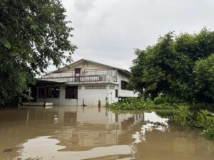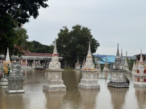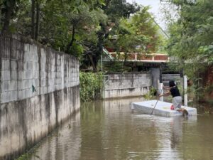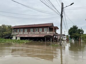 วันที่ 8 พ.ย.2568 ผู้สื่อข่าวได้ลงพื้นที่ริมแม่น้ำเจ้าพระยาในเขต อ.สามโคก จ. ปทุมธานี พบว่ามีน้ำเข้าท่วม บ้านเรือนประชาชน วัด โรงเรียนอีกครั้ง หลังเขื่อนเจ้าพระยาเพิ่มระดับการปล่อยน้ำเป็น 2,700 ลบ.ม/วินาที โดยระดับน้ำสูงกว่า 1 เมตร หลังจากเมื่อ 3 วันก่อน ระดับน้ำได้ลดลงจนเกือบปกติหลายแห่งได้รื้อกระสอบทราย คันกันน้ำและสะพานที่สร้างชั่วคราวออกเพราะคิดว่าระดับน้ำปกติ ตอนนี้ประชาชนในหลายพื้นที่ต้องหันกลับมาใช้โฟมและเรือในการสัญจรเข้าออกเพราะระดับน้ำที่สูงขึ้นมากจนไม่สามารถเดินลุยน้ำได้