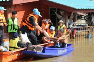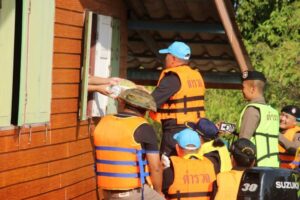 ต่อมาเวลา 15.00 น. พล.ต.ท.วัฒนา พร้อมคณะ ได้ขึ้นเรือตรวจเยี่ยมประชาชนที่ได้รับผลกระทบจากน้ำท่วมในพื้นที่ พร้อมมอบถุงยังชีพและยารักษาโรค เพื่อบำรุงขวัญและช่วยเหลือเบื้องต้นแก่ผู้ประสบอุทกภัยในเขตตำบลท่าดินแดง
