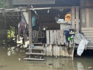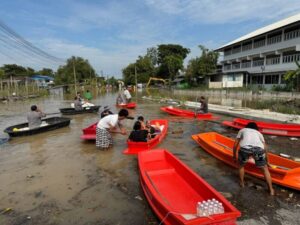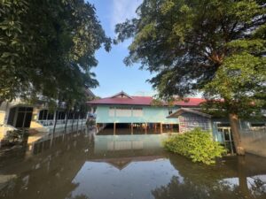 วันที่ 11 พ.ย. 2568 ผู้สื่อข่าวได้ลงพื้นที ที่ ต.ท้ายเกาะ อ.สามโคก จ.ปทุมธานี ซึ่งมีรอยต่อติดกับ อ.บางไทร จ.พระนครศรีอยุธยา ซึ่งเป็นด่านแรกที่จะรับมวลน้ำต่อจาก จ.พระนครศรีอยุธยา หลังจากเขื่อนเจ้าพระยาปล่อยน้ำเพิ่มเป็น 2,900 ลบ.ม/วินาที โดยพื้นที่ส่วนใหญ่ของ ต.ท้ายเกาะ อยู่ติดริมแม่น้ำเจ้าพระยา ทำให้ทั้งโรงเรียน วัดและบ้านเรือนประชาชนจมอยู่ในน้ำหลายร้อยหลังคาเรือน ประชาชนต้องนำรถและสัตว์เลี้ยงมาไว้ริมถนนที่น้ำยังท่วมไม่ถึง การสัญจรเข้าออกบ้านต้องใช้เรือและโฟมลอยน้ำในการสัญจร
