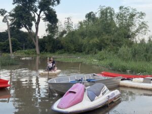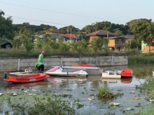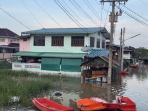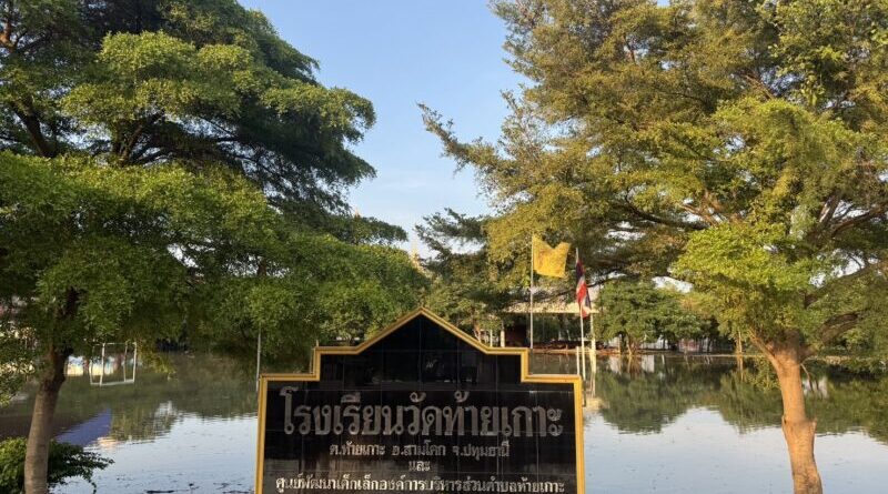 วันที่ 11 พ.ย. 2568 ผู้สื่อข่าวได้ลงพื้นที ที่ ต.ท้ายเกาะ อ.สามโคก จ.ปทุมธานี ซึ่งมีรอยต่อติดกับ อ.บางไทร จ.พระนครศรีอยุธยา ซึ่งเป็นด่านแรกที่จะรับมวลน้ำต่อจาก จ.พระนครศรีอยุธยา หลังจากเขื่อนเจ้าพระยาปล่อยน้ำเพิ่มเป็น 2,900 ลบ.ม/วินาที โดยพื้นที่ส่วนใหญ่ของ ต.ท้ายเกาะ อยู่ติดริมแม่น้ำเจ้าพระยา ทำให้ทั้งโรงเรียน วัดและบ้านเรือนประชาชนจมอยู่ในน้ำหลายร้อยหลังคาเรือน ประชาชนต้องนำรถและสัตว์เลี้ยงมาไว้ริมถนนที่น้ำยังท่วมไม่ถึง การสัญจรเข้าออกบ้านต้องใช้เรือและโฟมลอยน้ำในการสัญจร