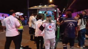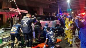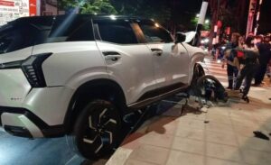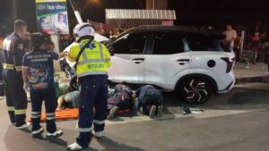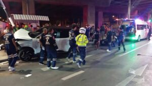 ผู้เห็นเหตุการณ์ ระบุว่า รถเก๋งไฟฟ้าขับมาด้วยความเร็วสูงและข้ามเลนมากะทันหัน พุ่งชนจักรยานยนต์ไปหลายคัน “เขาบอกว่าเขาวูบ แต่ตอนเดินลงมาจากรถก็ดูปกติ เหมือนข้ามเลนมาชนเองเลย”