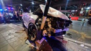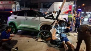 ใกล้กันพบรถยนต์ไฟฟ้า 5 ประตู มิตซูบิชิ Xforce iHEV สีขาว ทะเบียน 6 ขฬ 6763 กรุงเทพมหานคร ชนติดกับเสาไฟสัญญาณ ด้านหน้ารถพังเสียหาย ล้อหน้าฝั่งขวาเกยขอบฟุตปาธ และใต้ท้องรถพบหญิงติดอยู่ในสภาพนอนหายใจรวยริน ทราบชื่อภายหลังคือ นางสาว ศิริลักษณ์ อายุ 33 ปี เจ้าหน้าที่กู้ภัยต้องใช้อุปกรณ์ตัดถ่างช่วยนำร่างออกมา ก่อนเร่งส่งรักษาที่โรงพยาบาลบางประกอก 3 อาการสาหัส