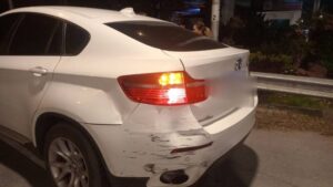 ส่วนใกล้จุดแยกพบรถยนต์หรู BMW X6 สีขาว ทะเบียน ศฮ 6 กรุงเทพมหานคร จอดอยู่ สภาพรถมีร่องรอยการเฉี่ยวชนเสียหายเช่นกัน
