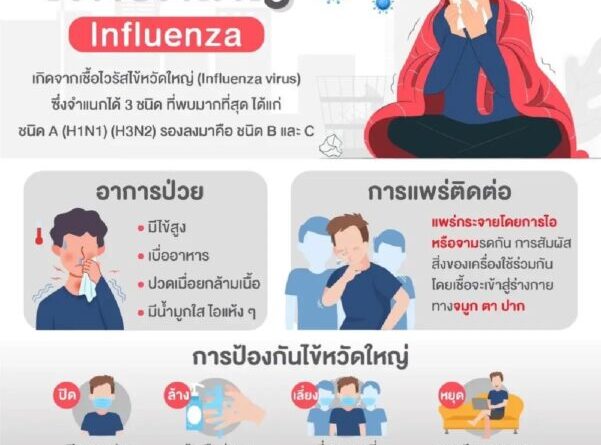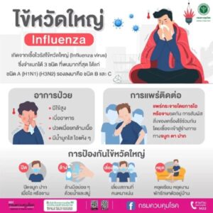 จากข้อมูลของกรมควบคุมโรค กระทรวงสาธารณสุข “ไข้หวัดใหญ่” เป็นโรคติดเชื้อระบบทางเดินหายใจ เกิดจากการติดเชื้ออินฟลูเอนซาไวรัส (Influenza Virus) มีการระบาดเป็นช่วงๆ ในฤดูฝนและฤดูหนาว ติดต่อผ่านการหายใจรับละอองฝอยจากน้ำมูก น้ำลาย ของผู้ป่วย และติดต่อผ่านมือสัมผัสกับละอองฝอยที่ปนเชื้อ แล้วนำมาสัมผัสกับจมูกหรือตา สามารถพบผู้ป่วยได้ทุกกลุ่มอายุ แต่จะพบมากในเด็ก กลุ่มเสี่ยงเสียชีวิต ได้แก่ กลุ่มอายุ 60 ปีขึ้นไป หรือผู้ที่มีโรคประจำตัว