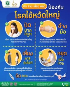 พร้อมเน้นย้ำ “หยุด วงจร ไข้หวัดใหญ่ด้วย DMH” D : Distancing คือ การรักษาระยะห่าง M : Mask Wearing คือ การสวมหน้ากากอนามัย และ H : Hand Washing คือ การล้างมือด้วยน้ำและสบู่ หรือเจลแอลกอฮอล์ กลุ่มเสี่ยง ควรไปรับวัคซีนป้องกันโรคไข้หวัดใหญ่ ทั้งนี้ ถ้าหากอาการไม่ดีขึ้น เช่น หอบเหนื่อย ซึมลง ควรรีบไปพบแพทย์โดยเร็ว โดยสามารถเข้ารับบริการได้ที่โรงพยาบาลทหารทั้ง 10 แห่งในพื้นที่ภาคเหนือ