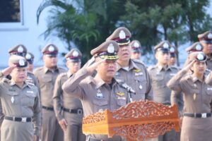 นำข้าราชการตำรวจในสังกัด เข้าแถวเคารพธงชาติ, กล่าวคำปฏิญาณตน และยืนสงบนิ่งถวายความอาลัยสมเด็จพระนางเจ้าสิริกิติ์ พระบรมราชินีนาถ พระบรมราชชนนีพันปีหลวง
