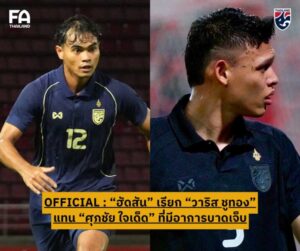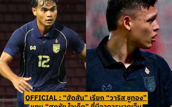 “แอนโธนี ฮัดสัน” หัวหน้าผู้ฝึกสอนฟุตบอลชายทีมชาติไทย เรียกตัว “วาริส ชูทอง” แบ็คขวาจากสโมสรบีจี ปทุม ยูไนเต็ด เข้ามาแทนที่ ศุภชัย ใจเด็ด ที่มีอาการบาดเจ็บจากการรับใช้ชาตินัดล่าสุด