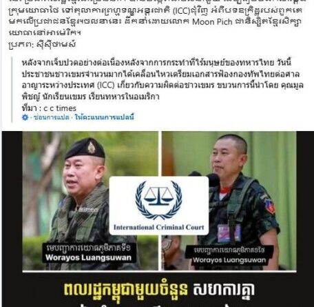 สื่อ Nokorwat News เผยแพร่ข้อมูลและนำภาพแม่ทัพภาคที่ 1 โพสต์ข้อความเตรียมรวบรวมข้อมูลเอกสารฟ้องร้องกองทัพไทย ต่อศาลอาญาระหว่างประเทศ (ICC) คาดผลจากมาตรการปิดด่านเข้ม ทำกัมพูชาไม่พอใจ เชื่อมโยงสถานการณ์ให้เป็นผู้ถูกกระทำ โดยข้อเท็จจริง ปรากฏแม่ทัพไก่ ลงพื้นที่ตรวจมาตรการเพื่อความเรียบร้อยเท่านั้น
