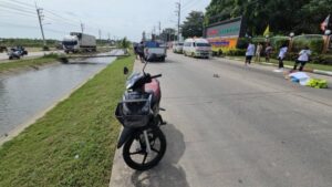 วันที่ 24 พ.ย.2568 ร.ต.ท.ธนกร โมรา รองสว.สอบสวนสภ.คลองหลวง รับแจ้งมีอุบัติเหตุรถจยย.ชนกับรถยนต์กระบะมีผู้เสียชีวิต ที่เกิดเหตุถนนเลียบคลองแอลหนึ่งสองหน้าศูนย์การเรียนรู้และสวนสาธารณะเทศบาลเมืองท่าโขลง ต.คลองหนึ่ง อ.คลองหลวง จ.ปทุมธานี หลังรับแจ้งจึงรุดไปที่เกิดเหตุพร้อมด้วยหน่วยกู้ชีพเทศบาลเมืองท่าโขลง อาสาสมัครมูลนิธิป่อเต็กตึ๊ง แพทย์รพ.ธรรมศาสตร์เฉลิมพระเกียรติ ตำรวจจราจรสภ.คลองหลวง