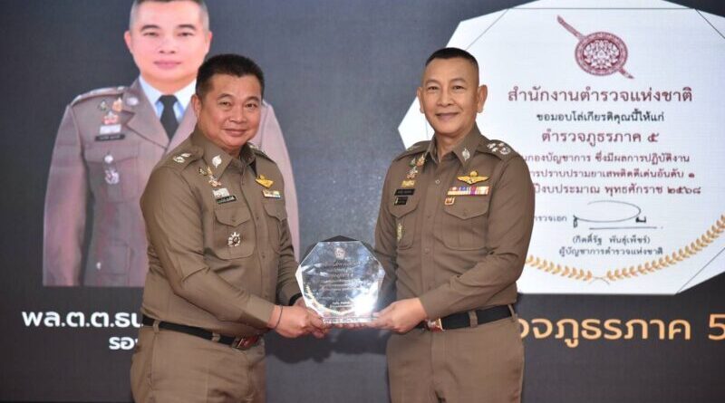 ตำรวจภูธรภาค 5 รับรางวัลคะแนนรวมสูงสุดลำดับ 1 ของประเทศ หน่วยงานที่มีผลการปฏิบัติงานดีเด่นด้านการปราบปราม และการบังคับใช้กฎหมายความผิดเกี่ยวกับยาเสพติด ของสำนักงานตำรวจแห่งชาติ ประจำปีงบประมาณ 2568
