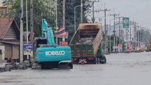 เมื่อเวลา 12.30 น. วันที่ 25 พ.ย. 68 เจ้าหน้าที่ทางหลวงยังคงเร่งกู้ ถนนทางหลวงหมายเลข 33 สุพรรณบุรี – ป่าโมก อำเภอป่าโมก จังหวัดอ่างทอง ที่ถูกน้ำท่วมสูงเป็นระยะทางกว่า 500 เมตร ตั้งแต่หน้าปั๊มปตท. ถึงหน้าหมู่บ้านทำกลอง โดยทางเจ้าหน้าที่ได้วางคันดินทั้งสองฝั่งถนน แล้วตั้งเครื่องสูบน้ำสูบน้ำออกทั้ง 2 ฝั่ง แต่น้ำยังไม่ลดระดับ
