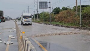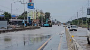 อ่างทอง – เจ้าหน้าที่ทางหลวงปรับแผนกู้ถนนทางหลวง33หลังพบสาเหตุน้ำเอ่อล้นท่อระบายน้ำ