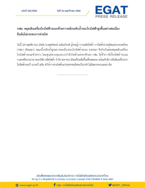 การไฟฟ้าฝ่ายผลิตแห่งประเทศไทย (กฟผ.) ระบุว่าต้องสั่งหยุดเดินเครื่องโรงไฟฟ้าจะนะ จ.สงขลา เป็นการชั่วคราว หลังระดับน้ำโดยรอบพื้นที่โรงไฟฟ้าสูงขึ้นต่อเนื่องจนเข้าข่ายเสี่ยงต่อความปลอดภัยของระบบผลิตไฟฟ้า