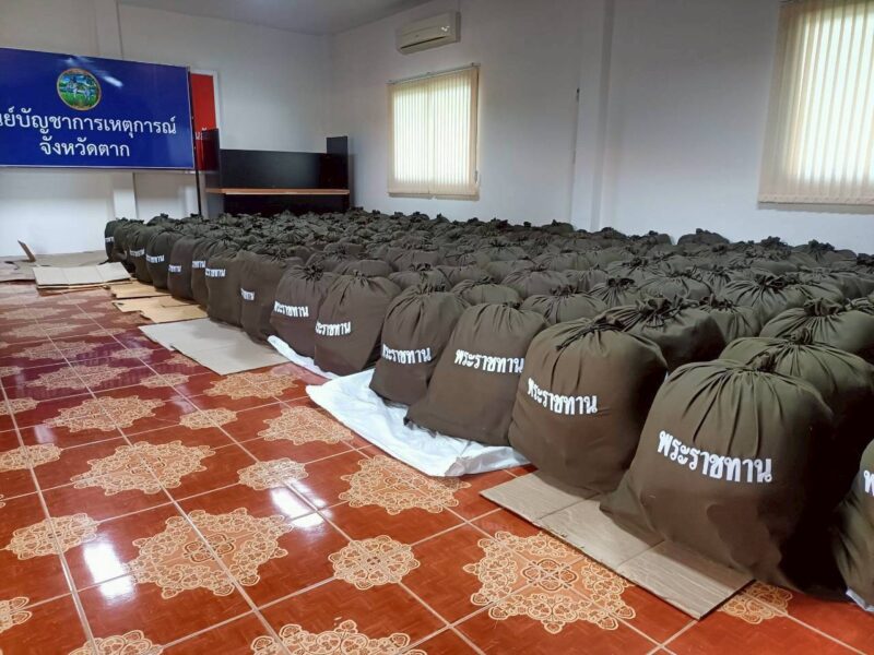 การบรรจุสิ่งของจัดขึ้น ณ สำนักงานป้องกันและบรรเทาสาธารณภัยจังหวัดตาก อำเภอเมืองตาก จังหวัดตาก เพื่อให้การเตรียมการเป็นไปด้วยความเรียบร้อย พร้อมสนับสนุนการปฏิบัติงานตามพระราชดำริอย่างเต็มกำลัง
