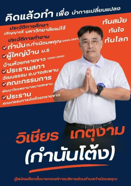 วันที่ 26 พฤศจิกายน 2568 ผู้สื่อข่าวรายงานว่า ที่ตำบลกำเนิดนพคุณ – นายวิเชียร เกตุงาม หรือ “กำนันโต้ง” ประธานกลุ่ม รวมน้ำใจกำเนิดนพคุณ ประกาศความพร้อมลงสมัครรับเลือกตั้งเป็นนายกองค์การบริหารส่วนตำบลกำเนิดนพคุณ โดยมีนายประสงค์ สมทรง (นายกแป๊ะ) และทีมงานบริหารคุณภาพร่วมสนับสนุนอย่างแข็งขัน พร้อมให้คำมั่นจะเดินหน้าพัฒนาตำบลในทุกด้าน เพื่อให้ประชาชนมีคุณภาพชีวิตที่ดีขึ้นอย่างเป็นรูปธรรม