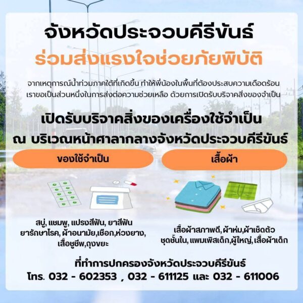 ผู้ว่าราชการจังหวัดประจวบคีรีขันธ์ เปิดเผยว่า ได้สั่งการให้ตั้ง ศูนย์ช่วยเหลือผู้ประสบอุทกภัยภาคใต้ บริเวณหน้าศาลากลางจังหวัด เพื่อรับบริจาคสิ่งของอุปโภคบริโภค และของใช้จำเป็นสำหรับส่งต่อไปช่วยประชาชนที่กำลังเผชิญน้ำท่วมในหลายพื้นที่ของภาคใต้