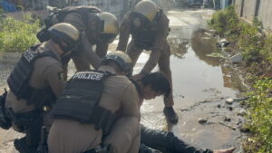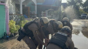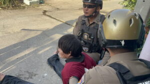ในที่เกิดเหตุพบว่ามีน้ำประปาไหลพุ่งนองพื้น พบชายเสื้อแดง เดินถือมีดยาวประมาณ 1 ฟุต เดินไปมาเล่นน้ำ บริเวณน้ำประปาที่ไหลนองหน้าบ้านตนเอง และเพื่อนบ้านใกล้เคียงอีก 2 หลัง ที่ถูกตัดท่อประปา ก่อนลงไปนอนกลิ้งกับพื้น เมื่อเห็นเจ้าหน้าที่ตำรวจจึงยอมให้จับโดยละม่อม ทราบชื่อต่อมา นาย หำ วัย 54 ปี ซึ่งอยู่บ้านคนเดียว ลูกเมียออกไปทำงาน