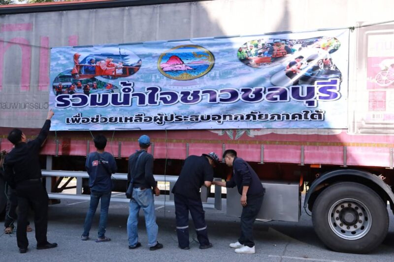 นายนริศ นิรามัยวงศ์ผู้ว่าราชการจังหวัดชลบุรีนำทีมส่งขบวนรถบรรทุกขนสิ่งของบริจาคเพื่อช่วยเหลือผู้ประสบอุทกภัยภาคใต้ โดยคันนี้เป็นคันที่ 6 หลังจากปล่อยขบวนรถไปเมื่อช่วงเช้า 5 คันซึ่งคันนี้บรรทุกน้ำดื่มล้วนๆ ส่งตรงถึงมือผู้ประสบภัย พร้อมปิดศูนย์รับบริจาคที่เปิดมาตั้งแต่วันที่ 24–26พฤศจิกายน 2568 โดยได้รับความร่วมมือจากประชาชนและทุกภาคส่วนในจังหวัดชลบุรีอย่างล้นหลามตลอดระยะเวลา 3 วันที่เปิดรับบริจาค พบว่า “น้ำใจคนเมืองชล” ได้หลั่งไหลมารวมกันอย่างไม่ขาดสาย ซึ่งสิ่งของทั้งหมดได้ถูกลำเลียงขึ้นรถขนส่งทั้ง 6 คัน เพื่อส่งตรงไปยังพี่น้องประชาชนที่กำลังเดือดร้อนในพื้นที่ภาคใต้ ผู้ว่าฯ ชลบุรีขอบคุณพลังแห่งการให้ของชาวชลบุรี