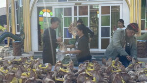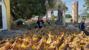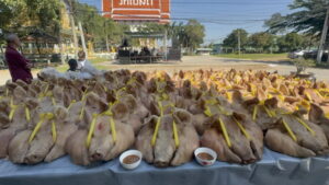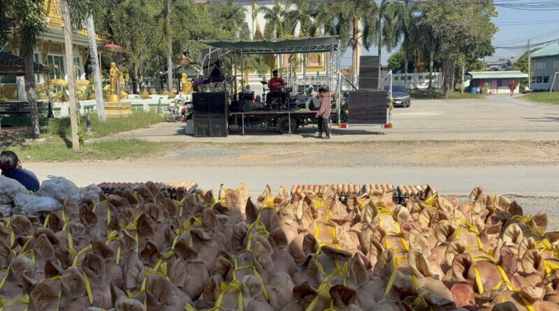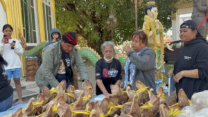 เมื่อเวลา 10.00 น. วันที่ 29 พ.ย. 68 ที่บริเวณหน้าวิหารหลวงพ่อสิงห์ วัดโบสถ์ ตำบลย่านซื่อ อำเภอเมือง จังหวัดอ่างทอง พบ เจ้นู แม่ค้าหมูสด ตลาดแต้ นำหัวหมู 99 หัว ไข่ไก่ 99 แผง วงดนตรีเต็มวง มาแก้บนถวายหลวงพ่อสิงห์ ช่วยรอดวิกฤตน้ำท่วม 2 หมู่บ้าน ตำบลย่านซื่อ