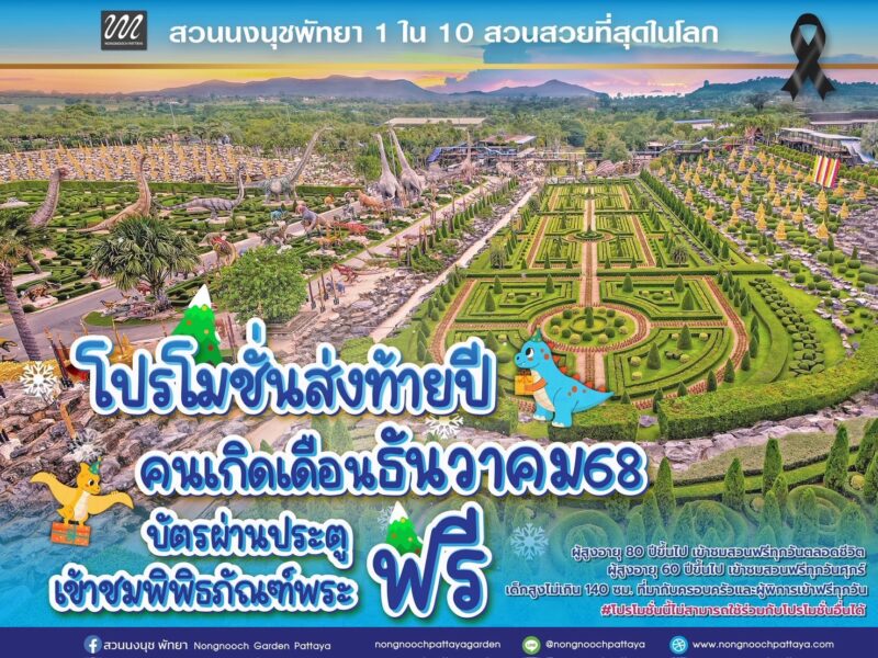 ท้ายปี โดย นายกัมพล ตันสัจจา ประธานสวนนงนุชพัทยา มอบของขวัญสุดพิเศษแด่ผู้ที่มีวันคล้ายวันเกิดในเดือนธันวาคม เพียงแสดงบัตรประชาชนหรือเอกสารยืนยันตัวตน ก็สามารถ เข้าชมสวนนงนุชได้ฟรีตลอดวัน พร้อมรับสิทธิชม “พิพิธภัณฑ์พระพุทธคุณ” ฟรี ระหว่างวันที่ 1–31 ธันวาคม 2568 เท่านั้น