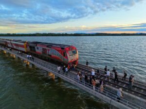 ชณะที่ ขบวนพิเศษช่วงเย็น “รถไฟลอยน้ำ” SRT ROYAL BLOSSOM เส้นทาง กรุงเทพฯ – พระนครศรีอยุธยา – เขื่อนป่าสักชลสิทธิ์ จังหวัดลพบุรี หยุดจอดชมพระอาทิตย์ตก บนกลางเขื่อนป่าสัก ตามนโยบายส่งเสริมการท่องเที่ยว ปี Amazing Thailand Grand Tourism and Sports Year 2025 ซึ่งรถไฟนำเที่ยวขบวนพิเศษ ชมพระอาทิตย์ตก มีกำหนดจัดขึ้น 2 ทริปด้วยกัน คือ ในวันจันทร์ที่ 3 พฤศจิกายน 2568 ที่ผ่านมา และวันจันทร์ที่ 17 พฤศจิกายน 2568 รวมนักท่องเที่ยวที่ซื้อแพคเก็จเดินทางท่องเที่ยวทั้ง 2 ทริป จำนวนกว่า 400 คน
