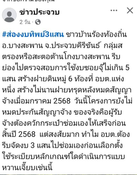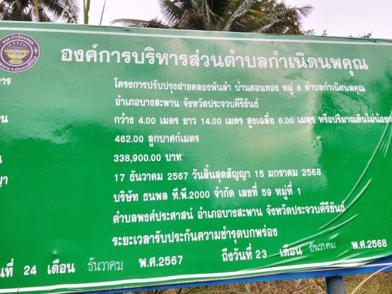 ด้านนายวรภูมิ เง้าบุ้งเค้า เลขาชมรมสตรองอำเภอบางสะพานกล่าวว่ารับคำร้องเรียนจากชาวบ้านแล้วก็เพจภาพประจวบ ก็ได้มาถึงพื้นที่จริงของหมู่ 6 บ้านดอนทองว่าทางชมรมสตรองก็เข้ามาสถานที่จริงว่าในการทำโครงการในครั้งนี้แล้วก็โครงการนี้ก็ยังอยู่ในช่วงของผู้รับเหมายังไม่หมดสัญญานะครับซึ่งจะหมดสัญญาประมาณช่วงวันที่ 23 เดือนธันวาคม 2568 นี้ก็เลยว่าอยากช่วยบอกถึงองค์การบริหารส่วนตำบลกำเนิดนพคุณผู้ว่าจ้าง เร่งรัดเรื่องของบริษัทที่เกี่ยวข้องมาซ่อมแซมทำให้ใช้งานได้จริงตามที่ชาวบ้านเรียกร้องก่อนที่จะหมดสัญญาก็เชื่อว่าเรื่องนี้เป็นเรื่องที่สำคัญเพราะว่าสายน้ำนี้เป็นสายน้ำของเกษตรกรในหมู่ 6 แล้วก็ถึงหมู่บ้านอื่นๆหมู่ 5 หมู่ 4 อ่าทั้งทั้งตำบลเลยเส้นนี้แล้วก็เชื่อว่า จะเร่งดำเนินการในครั้งนี้ให้แล้วเสร็จก่อนที่จะหมดตัวสัญญาโครงการในครั้งนี้