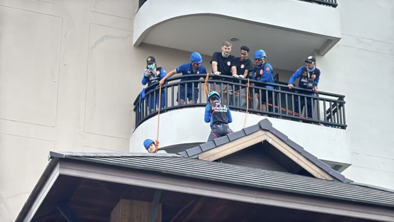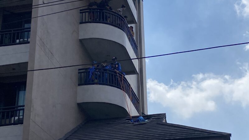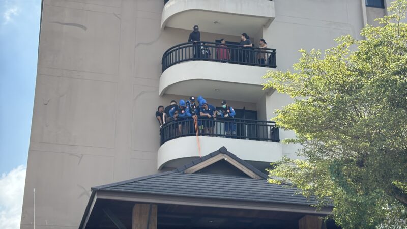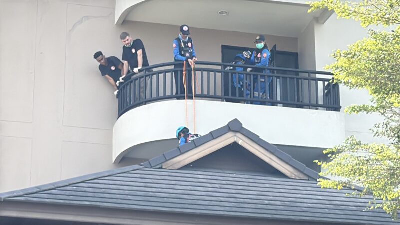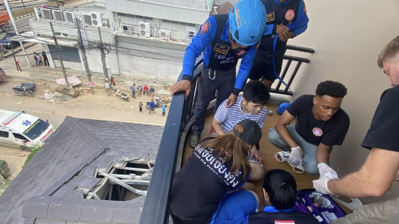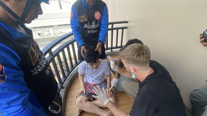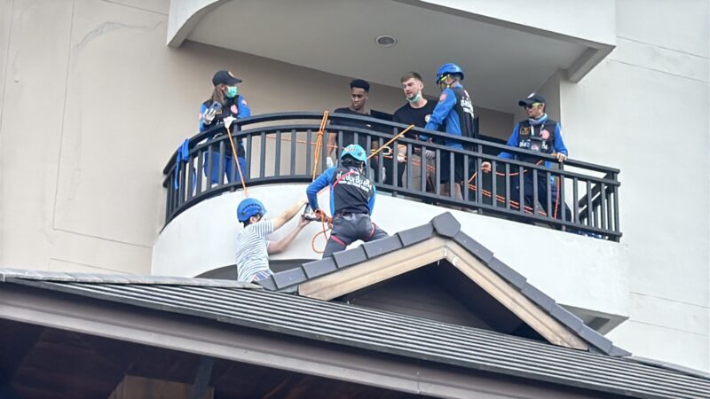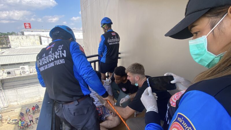 ในที่เกิดเหตุ เจ้าหน้าที่พบชายวัยรุ่นคนหนึ่ง อายุ 17 ปี นอนนิ่งอยู่บนบริเวณจั่วใต้หลังคาด้านหน้าของโรงแรม ซึ่งอยู่ระหว่างชั้น 3 โดยผู้บาดเจ็บมีอาการรู้สึกตัวและค่อนข้างปลอดภัย แต่ได้รับบาดเจ็บที่ข้อเท้าขวาผิดรูป
