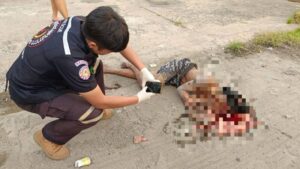ที่เกิดเหตุพบศพชายไม่ทราบชื่อ อายุประมาณ 35–40 ปี สวมเพียงกางเกงตัวเดียว ไม่มีเอกสารระบุตัวบุคคล นอนตะแคงเสียชีวิตอยู่บนพื้น สภาพศีรษะแตกมันสมองกระจาย ใกล้กันพบรถบัสรับส่งพนักงานยี่ห้อยูดี ทะเบียน 30-1679 สมุทรปราการ จอดอยู่ โดยที่ยางล้อหลังซ้ายพบชิ้นส่วนมันสมองติดค้าง